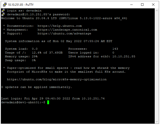 Let’s start PuTTY for connecting to the Virtual Machine. Enter your public IP address in Host Name and Port will be 22 as shown in the above screenshot and click on the Open button to connect.